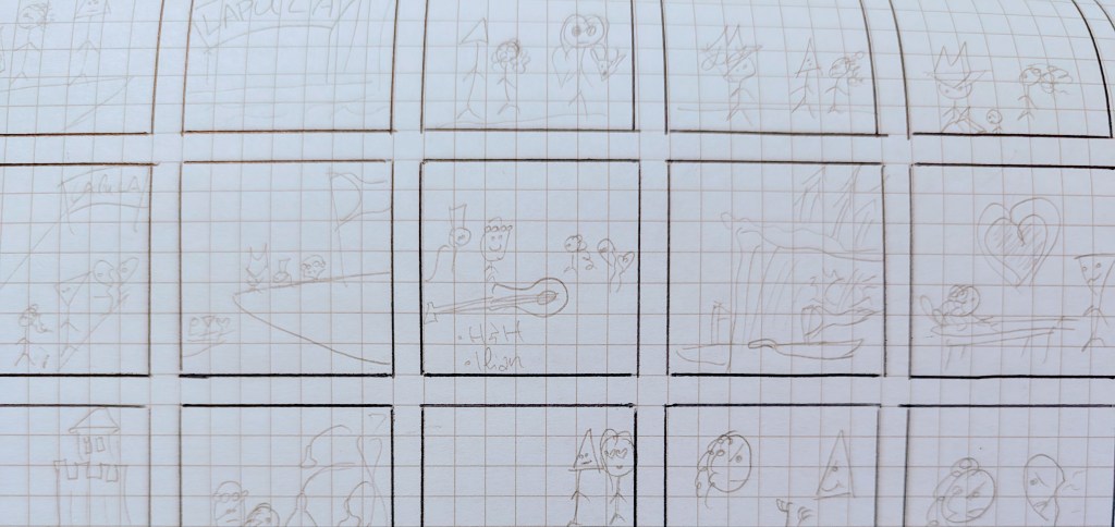 My very first step was to make sure I had a good, up-to-date storyboard of books 1 and 2 of the series. “Good” in this case meaning succinct and complete. You will see from my pictures that I have no drawing talent, and tend to identify my characters by the shape I give their heads.